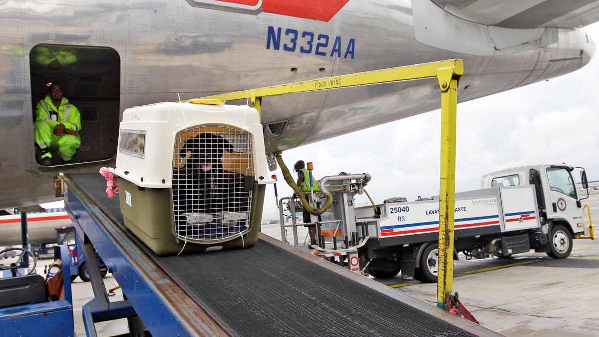 FILE – An American Airlines grounds crew unloads a dog from the cargo area of an arriving flight, Aug. 1, 2012, at John F. Kennedy International Airport in New York. American Airlines is relaxing part of its pet policy to let owners bring their companion and a full-size carry-on bag into the cabin. (AP Photo/Mary Altaffer, File)