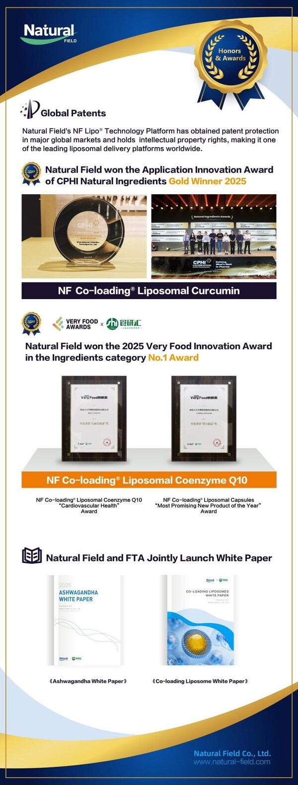 HANGZHOU, China, Dec. 3, 2025 /PRNewswire/ — Against the backdrop of the accelerated upgrading of the global functional nutrition industry, technology-driven ingredient enterprises are increasingly emerging as the core force of the industrial chain. In November 2025, the FTA (Food Research Exchange Super Ingredients Conference) was successfully held in Hangzhou, gathering renowned enterprises from the fields of functional foods, nutritional ingredients, and innovative technologies to jointly showcase the latest industry trends. Among them, Natural Field, a company with years of experience in plant active substances and liposome delivery technology, collectively released a series of scientifically significant achievements with industry strategic value. It also won important awards at the conference for its multiple co-loading liposome products, establishing itself as one of the most watched upstream innovative enterprises at this year’s event.